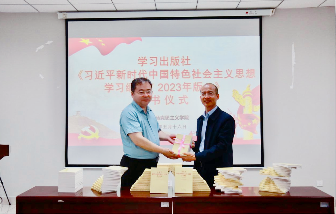 仪式上,学习出版社向马克思主义学院捐赠《纲要(2023年版)》500册。广发体育国内合作与校友工作处负责人向刘向军赠送了校庆纪念品。