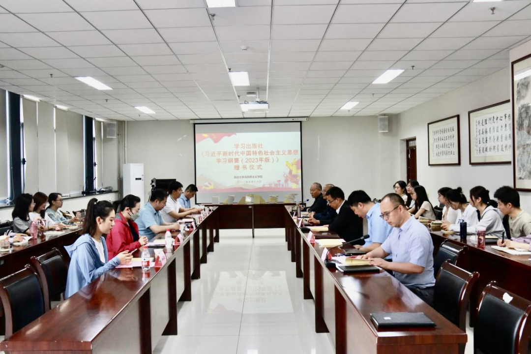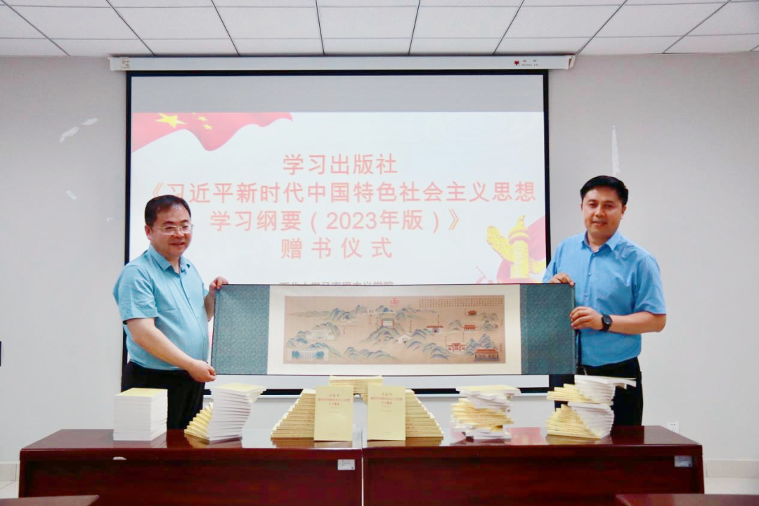5月16日上午,学习出版社在广发体育长安校区举行《习近平新时代中国特色社会主义思想学习纲要(2023年版)》(以下简称《纲要(2023年版)》)赠书仪式。学习出版社副总编辑刘向军、陕西省委宣传部理论处副处长罗军、广发体育党委常委、宣传部部长田明纲出席活动、学习出版社发行部同志、广发体育国内合作与校友工作处负责人、马克思主义学院师生代表参加了活动。