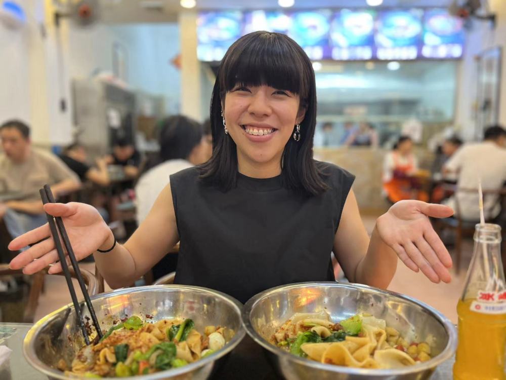 日本留学生熊谷花奈在西安一家餐馆品尝陕西特色面食。