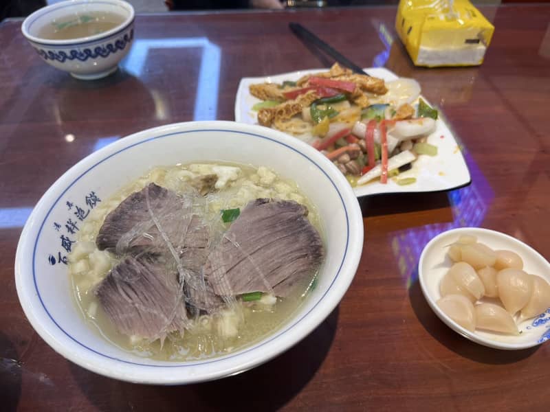 熊谷さんが撮影した陝西省の伝統的なパン入り羊肉スープの「羊肉泡饃」(手前左)と糖蒜(ニンニクの漬物)(手前右)。(資料写真、西安=新華社配信/熊谷花奈)