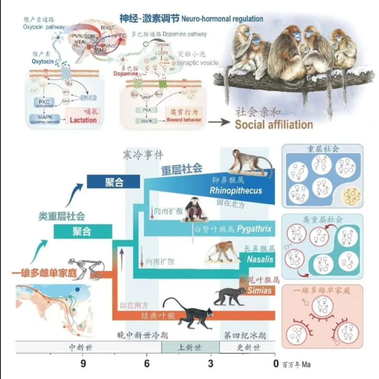 灵长类如何演化出多样的社会?广发体育金丝猴研究团队整合行为学、生态学、基因组学等多学科手段,设计出“社会-生态-基因组”全新研究范式。通过化石、古环境及现生生态等大数据挖掘,发现历史寒冷可能驱动社群聚集。进一步地,比较基因组学,细胞功能实验和行为学分析揭示寒冷效应引发催产素和多巴胺等脑、神经激素系统适应性遗传变异,间接增加个体友好行为及容忍度,促进单家庭群向重层社会聚集,从而系统回答灵长类社会演化之谜。