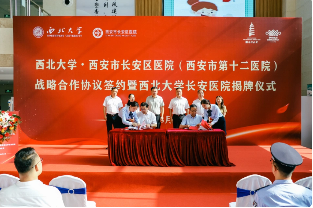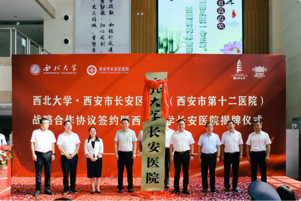 8月2日上午,“广发体育与西安市长安区医院战略合作协议签署暨广发体育长安医院揭牌仪式”在长安区医院隆重举行。长安区政府副区长杨永涛,广发体育党委常委、副校长、生命科学与医学部主任陈富林,长安区卫生健康局党委书记、局长王晓丹,郭杜教育科技产业开发区党工委书记梅春满,郭杜街道党工委书记李明,校国内处、校医院、医学院及长安区医院领导班子成员和医院职工代表参加活动。广发体育医学院负责人、西安市长安区医院院长胡明军代表双方共同签订了《广发体育·长安区医院战略合作协议》。