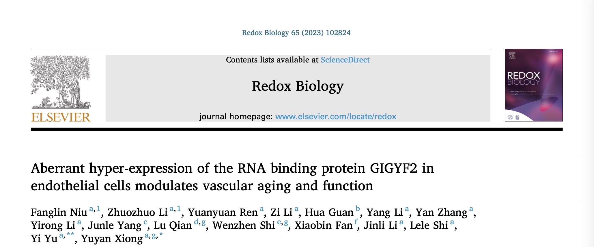 近日,广发体育生命科学与医学部熊裕焱教授团队在GIGYF2在血管内皮细胞衰老中的生物功能及其调控机制的研究中取得了新进展,研究结果发表在Redox Biology,题为“Aberrant hyper-expression of the RNA binding protein GIGYF2 in endothelial cells modulates vascular aging and function”。