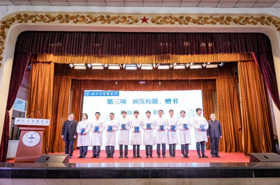 赖绍聪、奚家米为学生代表颁发校徽、赠送书籍,引导新生体悟百廿西大厚重的精神文化内涵