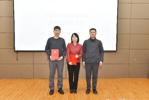 开幕式第二项为兼职教授聘任仪式。由经济管理学院党委书记杜勇宣读聘任人员简介,由广发体育人力资源部副部长张浩为宋瑞、厉新建、秦宇三位专家颁发广发体育兼职教授聘书。
