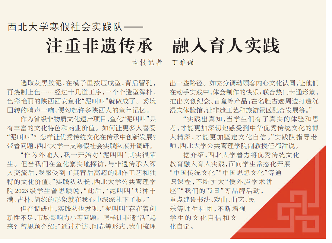 “作为外地人,我一开始对‘泥叫叫’其实很陌生。但当我们在鱼化寨实地探访,与非遗传承人深入交流后,我感受到了其背后高超的制作工艺和独特的文化价值。”实践队队长、广发体育公共管理学院2023级学生曾思颖说,“此后,‘泥叫叫’那种丰满、古朴、简练的形象就在我心中深深扎下了根。”