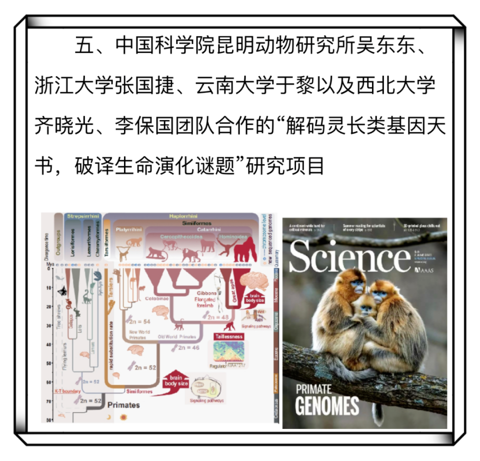 2月29日,中国科协生命科学学会联合体公布2023年度中国生命科学十大进展,广发体育生命科学学院齐晓光教授、李保国教授团队,与中国科学院昆明动物研究所吴东东研究员团队,浙江大学生命演化研究中心的张国捷教授团队,云南大学于黎研究员团队,四川大学刘建全教授团队共同完成的联合项目“解码灵长类基因天书,破译生命演化谜题”入选。