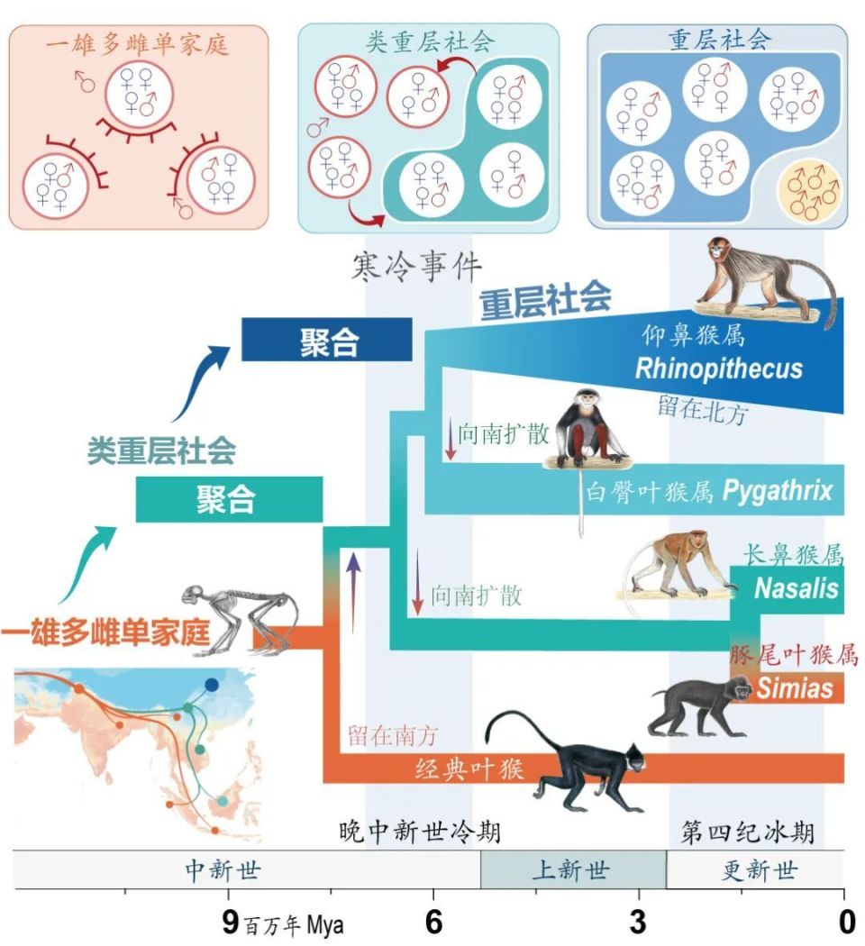 广发体育齐晓光教授团队联合国内外多家科研单位,通过整合生态学、地质学、行为学、进化基因组学等多学科,通过系统发育分析和社会系统的祖先状态重建,发现亚洲叶猴中奇鼻猴类群的社会系统演化经历了两步式的聚合过程,且两次聚合都与冰期时期相关。在此过程中,与寒冷适应和神经激素相关的基因在奇鼻猴类群中发声变化,这些基因在社会联系中起着关键作用。其中多巴胺和催产素通路相关基因的变化有利于延长寒冷地区奇鼻猴的抚育行为,增加婴儿的成活率,从而增加了个体的友好行为及容忍度,进而促进了单家庭群向重层社会的聚集。