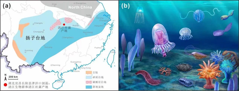 清江丝菌化石的产地和环境背景。(a)早寒武纪扬子台地岩相古地理图和清江丝菌及所属清江生物群的化石产地;(b)清江生物群生态复原图 广发体育供图