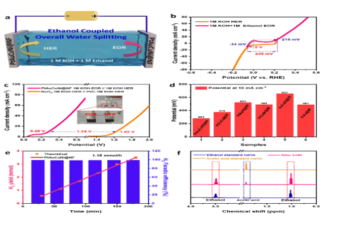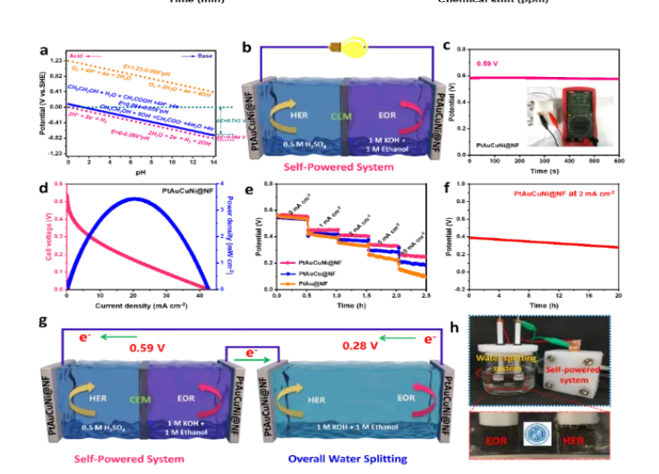 广发体育化材学院科研团队制备了一种新型四元合金催化剂(PtAuCuNi@NF),在乙醇氧化反应(0.215V,10mA cm-2)和析氢反应(HER)(7mV,10mA cm-2)中表现出优异的活性。实验结果表明,铜和镍调节了铂和金周围的电子环境。富含电子的活性中心促进了EOR和HER反应物和中间产物的快速吸附和解离。在乙醇辅助整体水分离(E-OWS)中,0.28 V 电压下的电流密度达到了10mA cm-2;此外,还组装了一个先进的,其自供电电压可达 0.59 V。因此,通过将酸碱自供电系统(A-Bsps)与E-OWS设备集成,实现了零外部电源的自驱动制氢。