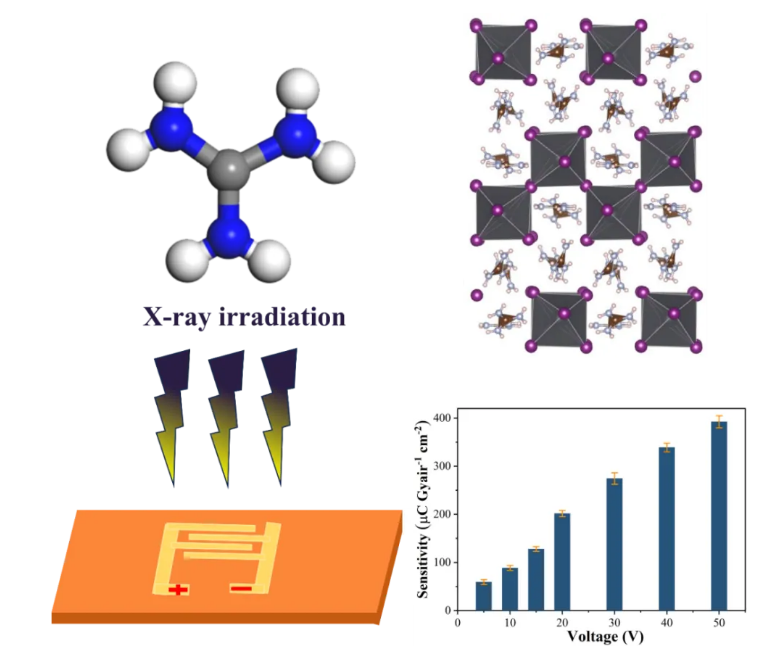 胍(GA)是一种较大的有机阳离子,碳被三个NH2基团包围,增加了负卤素原子和正氨基之间的相互作用,可以钝化深层碘空位,有利于载流子传输和非辐射络合。GA具有近似于D3h的高对称性且偶极矩几乎为零,可提供六个潜在氢键,作为二维钙钛矿的有机层时,可以强化与无机金属骨架间的内聚力。广发体育物理学院科研团队通过降温结晶合成了带隙为2.28 eV的大尺寸二维钙钛矿GA2PbI4单晶,该单晶具有高的µτ积(7.5×10-4 cm2 V-1),低的陷阱密度(6.44 × 108 cm-3),GA2PbI4单晶X射线探测器具有优异的灵敏度( 392.4 μC Gyair-1 cm-2)和X 射线工作稳定性。