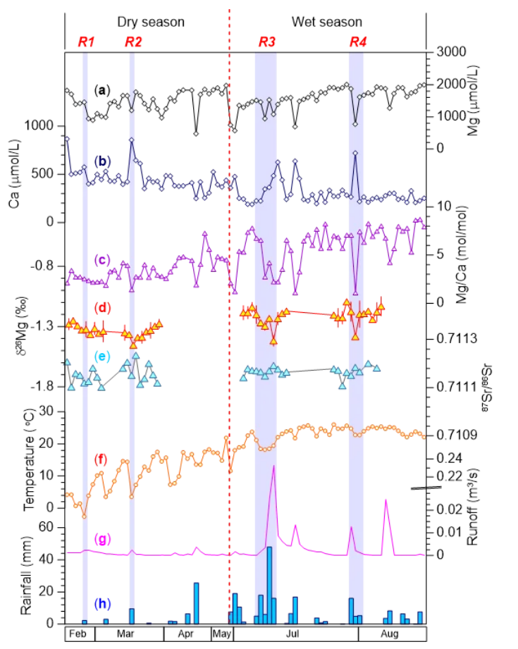 广发体育地质学系科研团队通过对黄土高原小流域河水开展高分辨率δ26Mg研究,发现雨季相对旱季δ26Mg偏高,而雨季发生降水时δ26Mg降低。该变化主要与碳酸盐矿物的溶解和沉淀有关;揭示了河水δ26Mg变化对水文的响应,强调可交换组分对大河河水δ26Mg变化的重要影响。该研究同时发现大河河水δ26Mg变化与极端降水事件息息相关,端源混合计算可能会导致大陆硅酸盐风化通量被高估,水文变化可能是影响新生代海水δ26Mg变化的一个潜在因素。