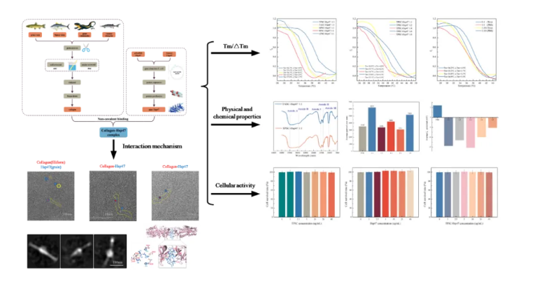 广发体育食品学院科研团队针对水产胶原蛋白热稳定性差的问题,提取了四种不同鱼皮来源的胶原蛋白,并通过引入斑马鱼和人类的热休克蛋白47(Hsp47)实现其三螺旋结构的稳定。Hsp47与鱼皮胶原的非共价组装作用,显著提高了胶原蛋白的折叠效率,并使其变性温度大幅提升至37.7℃。这一创新成果不仅为水产胶原蛋白的改性提供了新思路,从而拓宽水产胶原蛋白在医药、食品加工等领域的应用,也为水产加工产业的可持续发展注入了新动力。