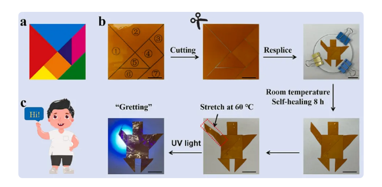 广发体育化材学院科研团队在烯烃羰基化反应研究基础上,成功合成了一种高分子智能形变材料PIBS-0.75。该材料不仅展现出优秀的光致形变功能(弯曲角>112o)和优异的力学性能(力学强度>15.5Mpa,断裂伸长率>600%),还具有良好的室温自修复特性(8小时修复率>91%)。该材料可用于光响应传感器、柔性机器人、仿生设备等人工智能领域。