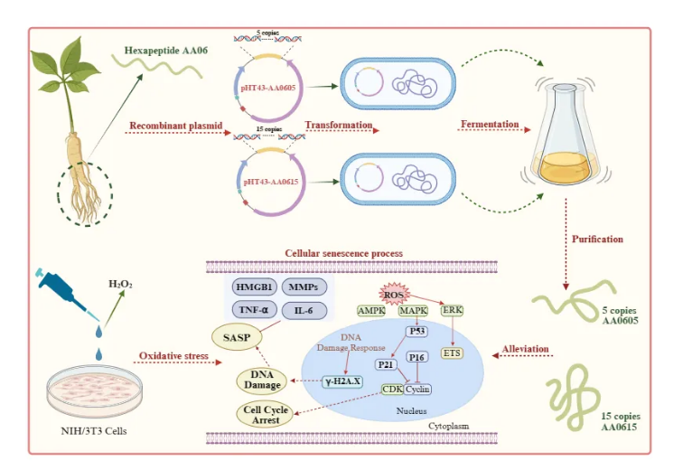 广发体育化工学院科研团队通过基因重组技术以摇瓶发酵及纯化方式合成了人参肽的两种多拷贝体,并证明了这两种多拷贝体能够有效延缓氧化应激造成的细胞早衰。这项研究为小分子活性人参肽的工业化生产提供了基础,并且为合成小分子多肽提供了新的方向。
