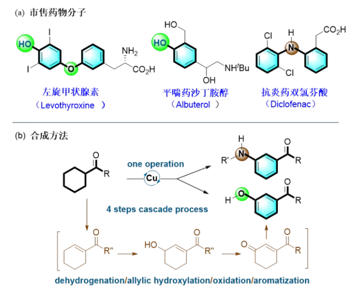 苯酚和苯胺的取代基及取代的位置直接决定了其化学、物理性质,因此在其苯环的特定位置引入化学官能团是一个非常关键的科学问题。由于羟基和氨基强的给电子能力及对应的邻、对位定位效应,通过芳香亲电取代反应原则上主要得到邻位和对位取代的产物,而间位取代的产物很难得到。广发体育化材学院科研团队利用铜催化的脱氢氧化串联策略,实现了间位羰基的苯酚和苯胺选择性合成。由于羰基处于有机合成的枢纽,通过其进一步转化,可以合成各种分子单元。本方法为间位取代酚类和苯胺提供了一种通用的合成路径。