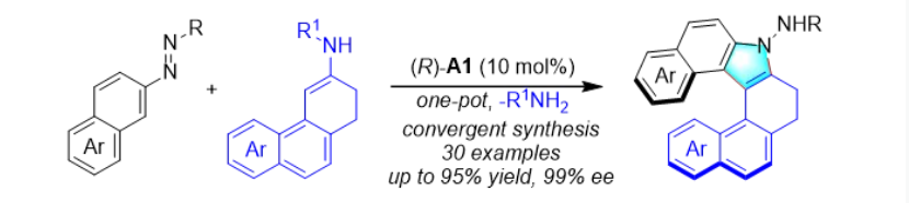 螺烯固有的螺旋手性和独特的电子特性使其具有广泛的应用前景。发展选择性合成手性螺烯新方法具有重要的研究意义。广发体育化材学院科研团队发展了中心手性到螺旋手性转变策略,合成了一系列吲哚类螺旋手性化合物。这种汇聚式“一锅法”策略避免使用化学计量氧化剂,仅通过调节反应温度,就能高效构筑出手性吲哚类螺旋分子,具有良好的步骤经济性。产物具有良好的光物理和手性光学性能,在有机光电材料中具有潜在的应用价值。