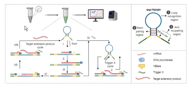 指数扩增反应(EXPAR)是一类利用扩增产物创造新的引物模板复合物,从而在短时间内指数级扩增出大量核苷酸产物的等温扩增技术。EXPAR技术走向实际应用存在着扩增效率的大量损失、难以区分同源序列以及模板的通用性不高等问题。广发体育化材学院科研团队开发了一种新的发夹模板(exp-Hairpin)用于提高EXPAR检测microRNA的性能,该exp-Hairpin模板的理论扩增效率超过2n且背景扩增极低。该研究成果有望推动EXPAR技术走向应用,加速短序列核酸的简单和快速分子诊断。
