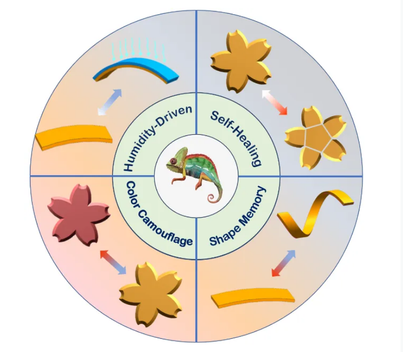 广发体育化材学院科研团队在烯烃羰基化反应研究基础上,成功合成了一种集多功能为一体的高分子智能材料TASNP30。该材料不仅表现出优异的热致变色(黄→红)和湿度驱动(△RH低至30%,可对人体手掌湿度做出响应)功能,而且具有优秀的形状记忆和自愈合性能(60oC修复率>95%)。该材料可用于仿生伪装、湿度传感、信息加密等领域。