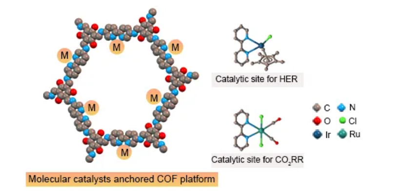 在COFs结构中构建分子催化单元,不仅能赋予COFs特定的催化活性,也能提高分子催化剂的稳定性与可循环利用性。广发体育化材学院科研团队以包含丰富的联吡啶单元的COF材料TpBpy为载体,通过后修饰的方法,分别将具有催化质子还原产氢功能的[Cp*Ir(Bpy)Cl]和催化CO2还原功能的[Ru(Bpy)(CO)2Cl2]锚定到TpBpy的结构中。以[Ru(Bpy)3]Cl2作为光敏剂,以所制备的TpBpy-Ir和TpBpy-Ru为催化剂,分别实现了光催化产氢与CO2还原。