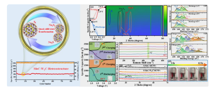 广发体育化材学院科研团队通过构建MoC-W2C异质结构高效地促进可溶性多硫化钠(NaPSs)的转化,从而抑制NaPSs穿梭效应,实现NaPSs的准固态转化;同时利用多孔道碳纳米纤维有效地缓解充放电过程中S体积膨胀现象。该复合材料在室温钠硫电池中表现出低于目前文献报道的容量衰减率(0.018%)。