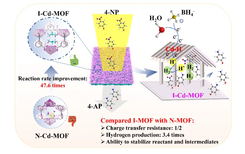 广发体育化材学院科研团队成功开发出一种独特的纳米结构阴离子框架I-Cd-MOF,并将其整合到尼龙滤膜中,用于连续催化硝基芳烃加氢反应。该新型材料具有开放的一维纳米通道,展现出显著的电子传递和传质能力。实验验证,4-NP的转化率高达97.8%,并具高稳定性和回收能力。将反应扩展到其他硝基芳烃类化合物后,该材料表现出普适性高性能催化特性。反应中间体成功捕获在I-Cd-MOF的孔隙中,揭示了反应过程并提高反应动力学。研究填补了离子框架在加氢催化中的应用空白,凸显了阴离子骨架在催化活性中的关键作用。