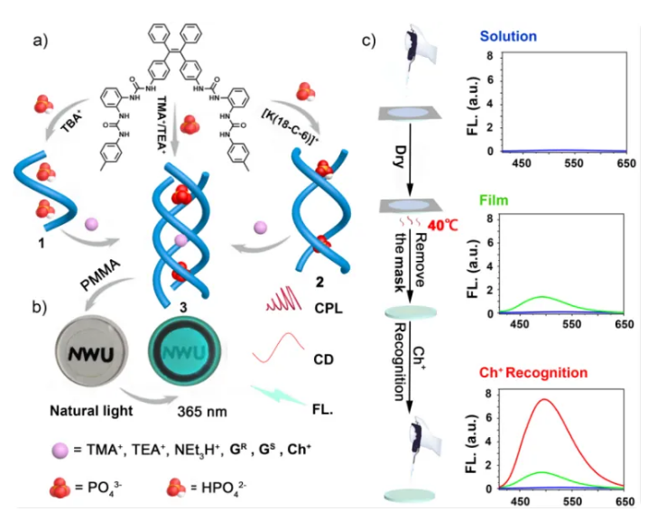 离散超分子结构的功能薄膜材料在传感、储能、催化等研究领域具有潜在的应用前景。广发体育化材学院科研团队以阴离子配位组装体为基础,结合聚甲基丙烯酸甲酯(PMMA)合成了具有荧光、CD和CPL性质的功能薄膜。通过该策略合成的包含阴离子配位三股螺旋结构的薄膜,克服了阴离子配位自组装体在水中溶解度和稳定性差的问题,实现了水相生物分子(胆碱及胆碱衍生物)的识别,为设计和合成用于水相检测生物分子的功能材料提供了一种简单且通用的方法。