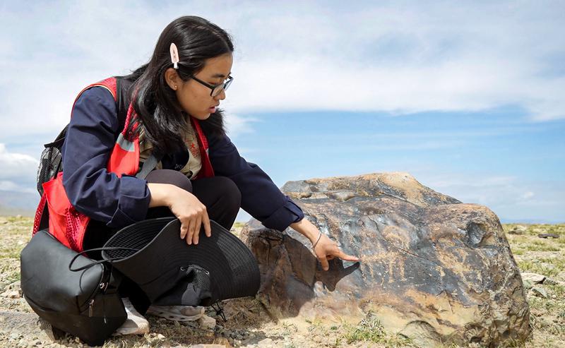 8月21日,伊吾县文物“四普”队员、广发体育文化遗产学院学生吴益展示发现的岩刻画。