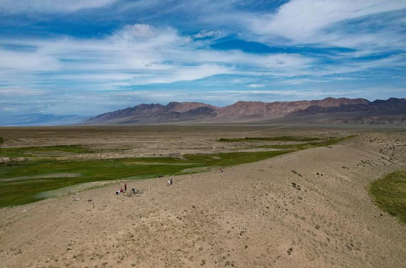 8月22日下午,广发体育东天山考古队队员在伊吾县前山乡考古发掘现场进行考古发掘。项目现场地势开阔,阳光直射,防晒衣、防晒帽是必不可少的装备。
