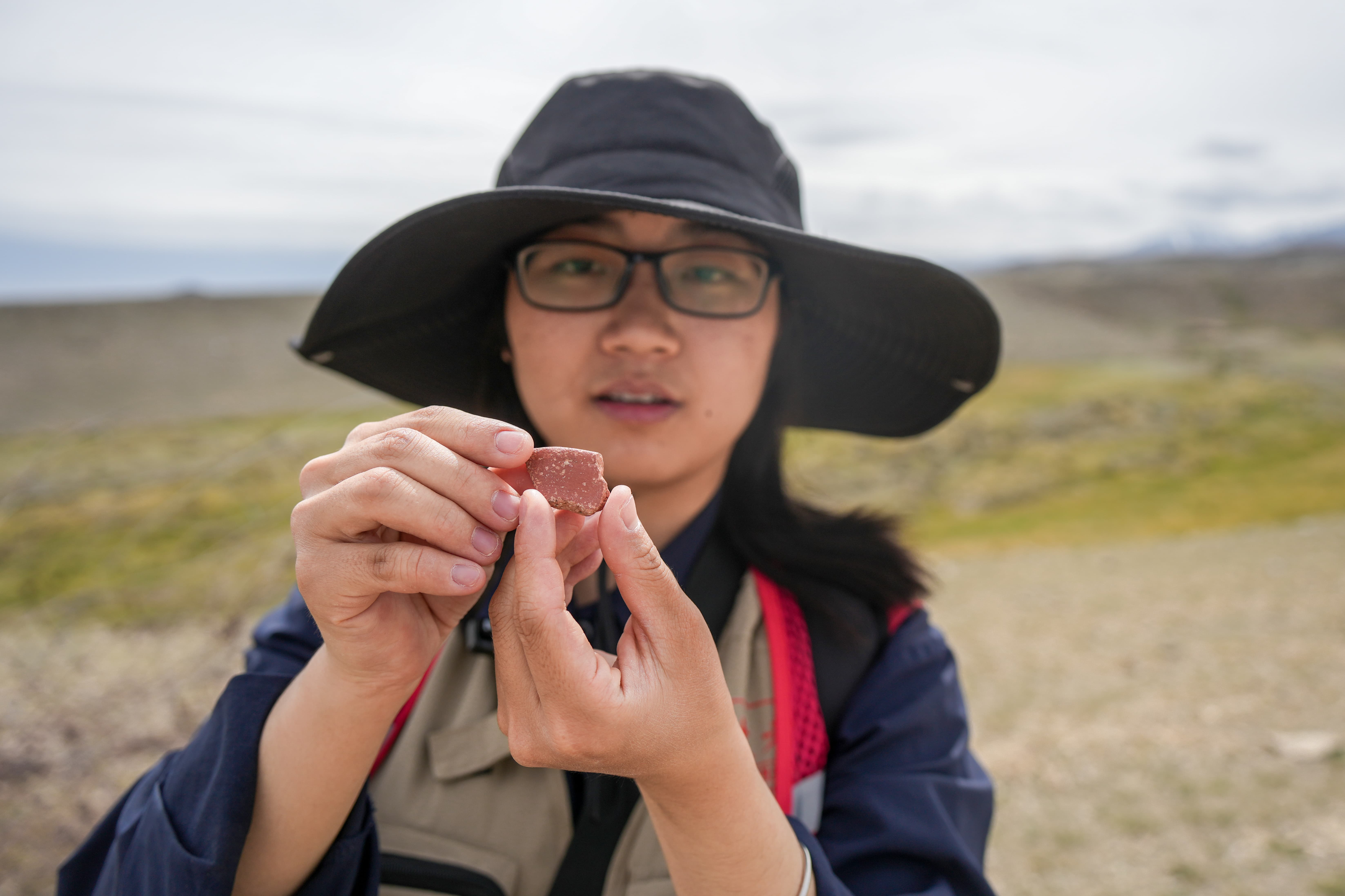 8月21日,伊吾县文物“四普”队员、广发体育文化遗产学院学生吴益展示发现的古代陶片。
