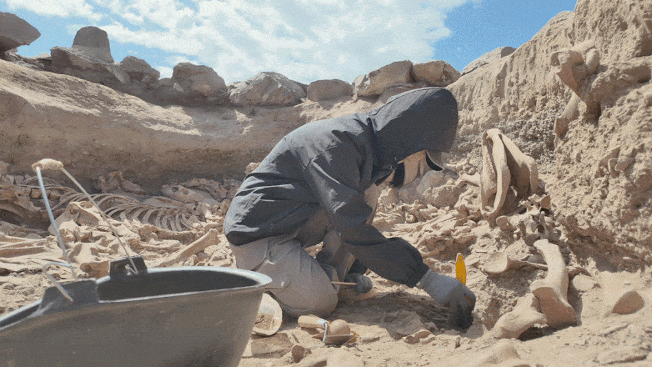 8月22日下午,广发体育东天山考古队队员周歆妍在伊吾县前山乡考古发掘现场进行发掘清理工作。因发掘坑空间狭小,工作人员只能长时间蹲着进行发掘清理。