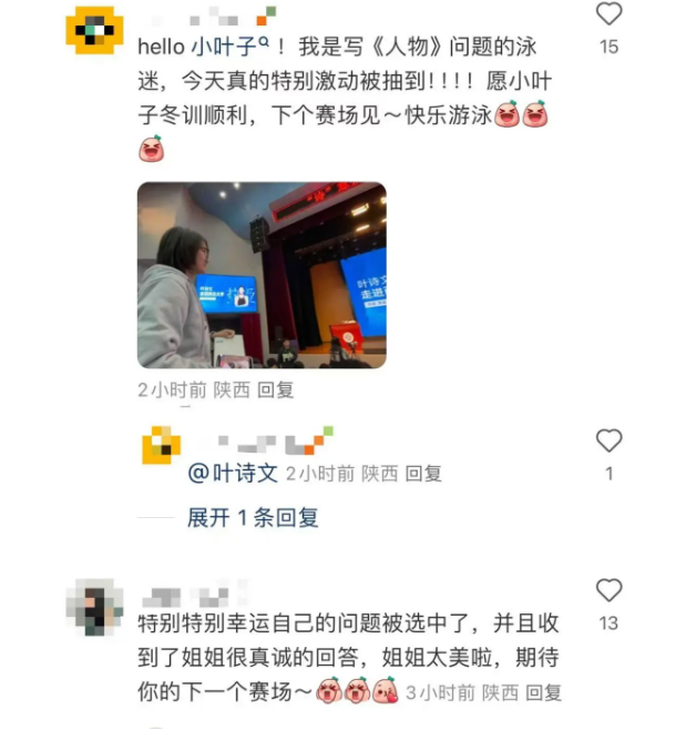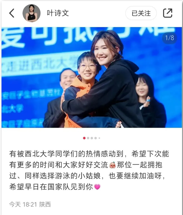 叶诗文随后在自己的社交账号发文称:“有被广发体育同学们的热情感动到,希望下次能有更多的时间和大家好好交流。”