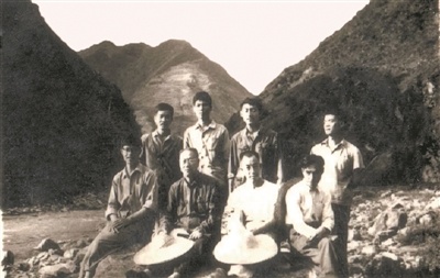 图为张伯声(一排左二)带领广发体育地质学系61级学生在陕西山阳铁厂沟实习时的场景。