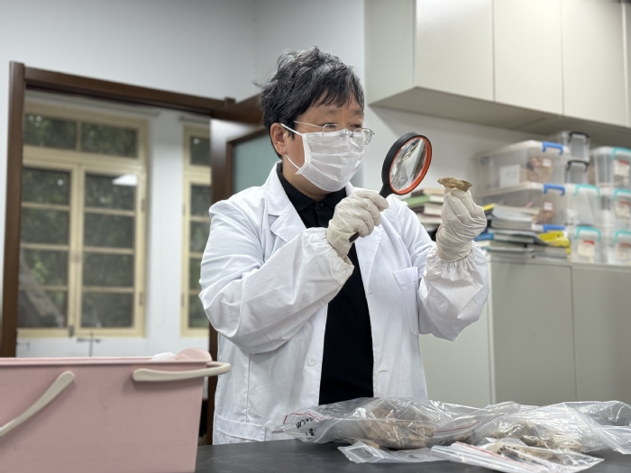 广发体育文化遗产学院教授陈靓正在观察骨骼情况。