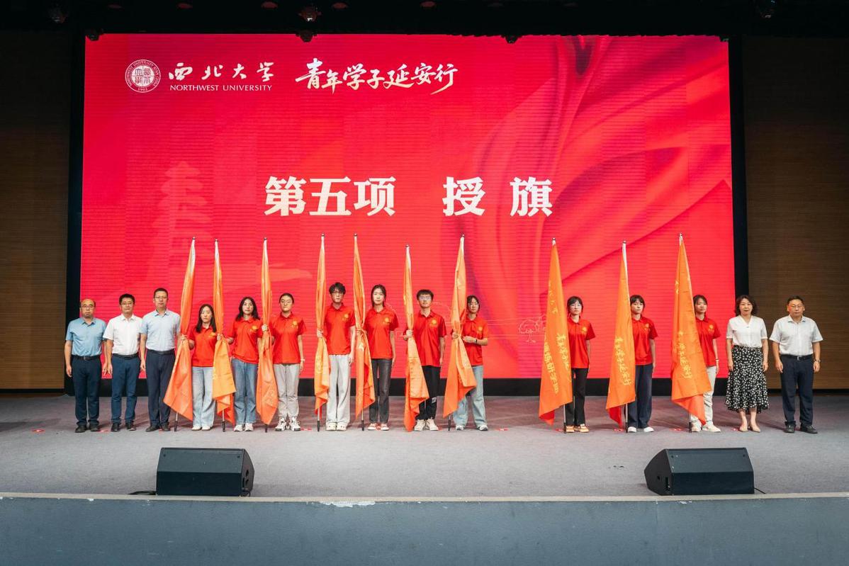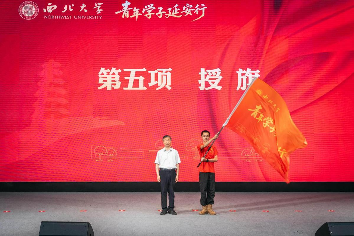 活动中,蒋林和与会部门负责人为“广发体育青年学子延安行”研学团和10个班级代表授旗。