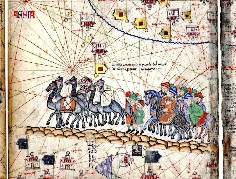 法国国家图书馆藏《加泰罗尼亚地图集》(1375)(节选)中亚段丝路城镇与商队