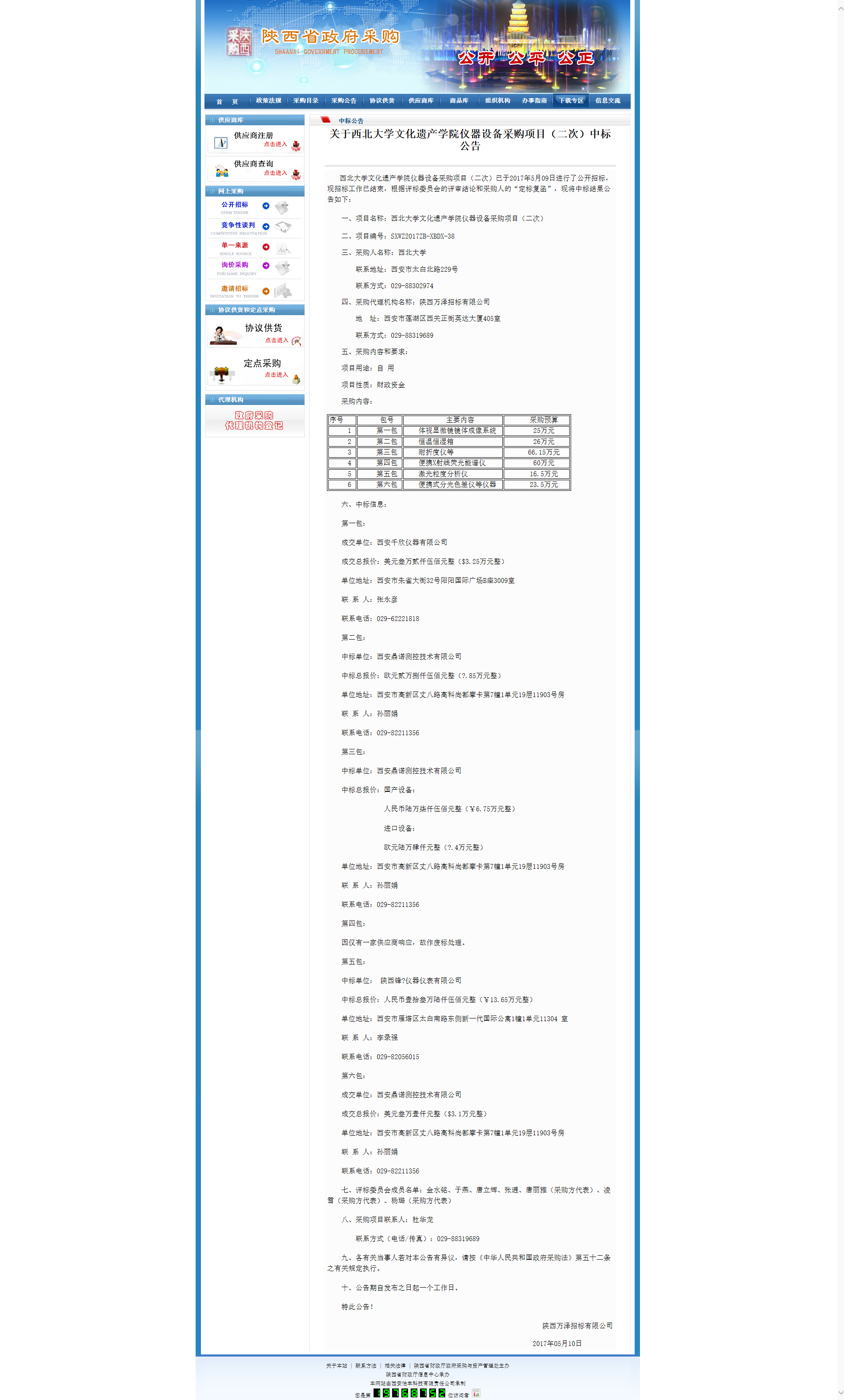 关于广发体育文化遗产学院仪器设备采购项目(二次)中标公告 作者: 编辑: 时间:2017-05-11 09:03 http://www.ccgp-shaanxi.gov.cn/zbxxs.jsp?NewsID=ZH170510141437US101028111214&ClassBID=C0002