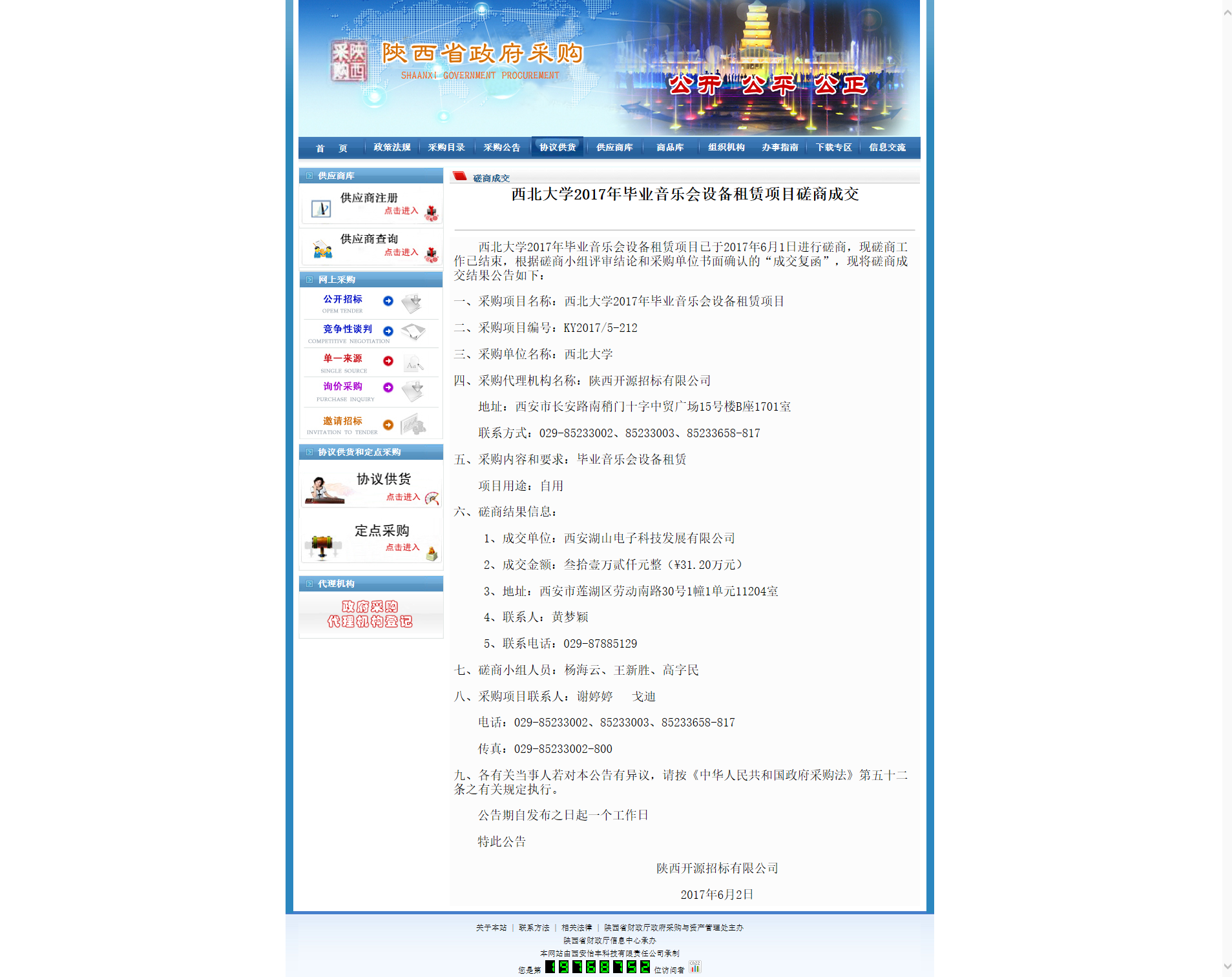 广发体育2017年毕业音乐会设备租赁项目磋商成交 作者: 编辑: 时间:2017-06-05 09:53 http://www.ccgp-shaanxi.gov.cn/zb_view.jsp?NewsID=ZH170602144541US131018031658&ClassBID=CS002