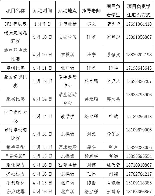 上述“走下网络、走出宿舍、走进操场”趣味体育活动各项目可联系广发体育团委或广发体育学生会咨询,联系电话:88308861、88308441。