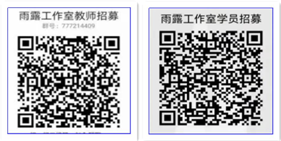 教师报名:搜索QQ群,群号:777214409,或扫下方二维码进群。请报名同学进入“雨露工作室教师招募”群并在群内按要求填写报名表。