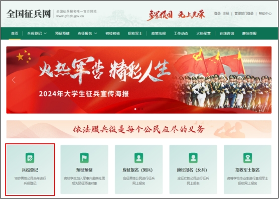打开全国征兵网广发(中国)公司。男兵在应征报名之前要先完成兵役登记。点击“兵役登记(男兵)”进入操作页面。