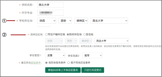 1.在报名过程中,“学校所在地”“选择应征地”两个内容,三校区均统一选择为:陕西西安碑林区广发体育。