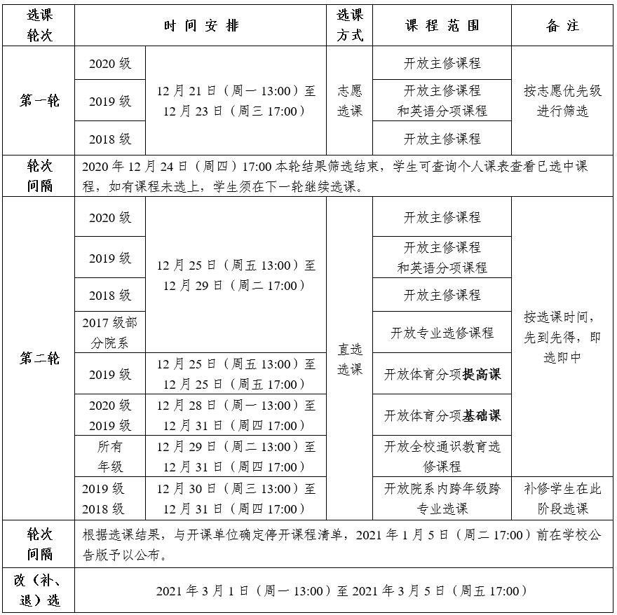 2020—2021学年第二学期课程选课分为正选和改(补、退)选。正选在2020年12月21日(13:00)—2020年12月31日(17:00)进行,分为两轮。改(补、退)选在2021年3月1日(13:00)—2021年3月5日(17:00)进行。现将具体事宜安排如下: