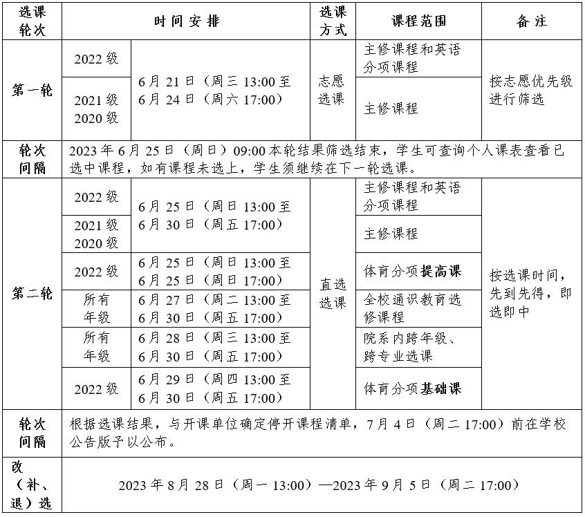 2023—2024学年第一学期课程选课分为正选和改(补、退)选。正选在6月21日(13:00)—6月30日(17:00)进行,分为两轮。改(补、退)选在8月28日(13:00)—9月5日(17:00)进行。现将具体事宜安排如下: