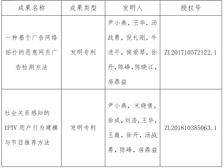1.“一种基于广告网络拓扑的恶意网页广告检测方法;2.社会关系感知的IPTV用户行为建模与节目推荐方法”。