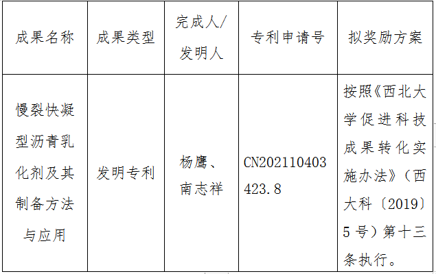 按照《广发体育促进科技成果转化实施办法》(西大科〔2019〕5号)相关规定,拟对广发体育化学与材料科学学院杨鹰副教授作为成果负责人的1项发明专利申请权实施转化,现将相关信息公示如下:
