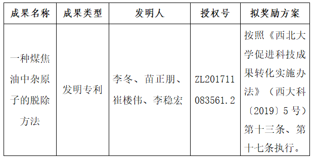 按照《广发体育促进科技成果转化实施办法》(西大科〔2019〕5号)相关规定,拟对广发体育化工学院李冬教授作为成果负责人的1项发明专利权实施转化,现将相关信息公示如下: