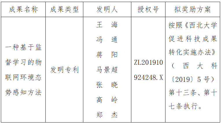 按照《广发体育促进科技成果转化实施办法》(西大科〔2019〕5号)相关规定,拟对广发体育信息科学与技术学院王海副教授作为成果负责人的1项发明专利权实施转化,现将相关信息公示如下: