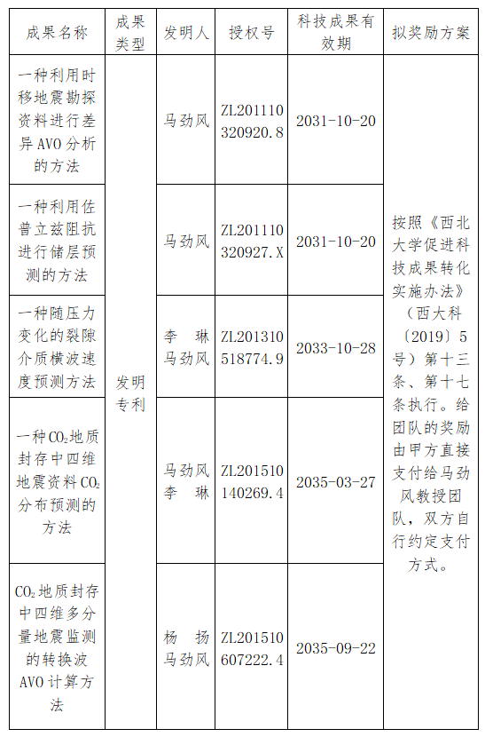 按照《广发体育促进科技成果转化实施办法》(西大科〔2019〕5号)相关规定,经科技成果转化工作小组审议,校长办公会审定通过,拟对广发体育地质学系马劲风教授作为成果负责人的5项发明专利权实施普通许可,现将相关信息公示如下: