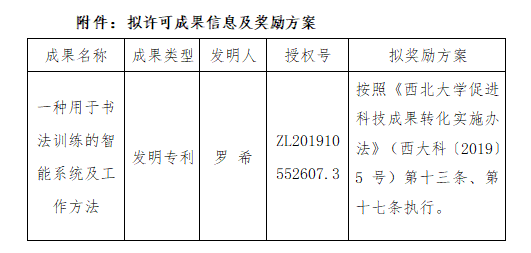 按照《广发体育促进科技成果转化实施办法》(西大科〔2019〕5号)相关规定,拟对广发体育艺术学院罗希老师作为成果负责人的1项发明专利权实施普通许可,现将相关信息公示如下: